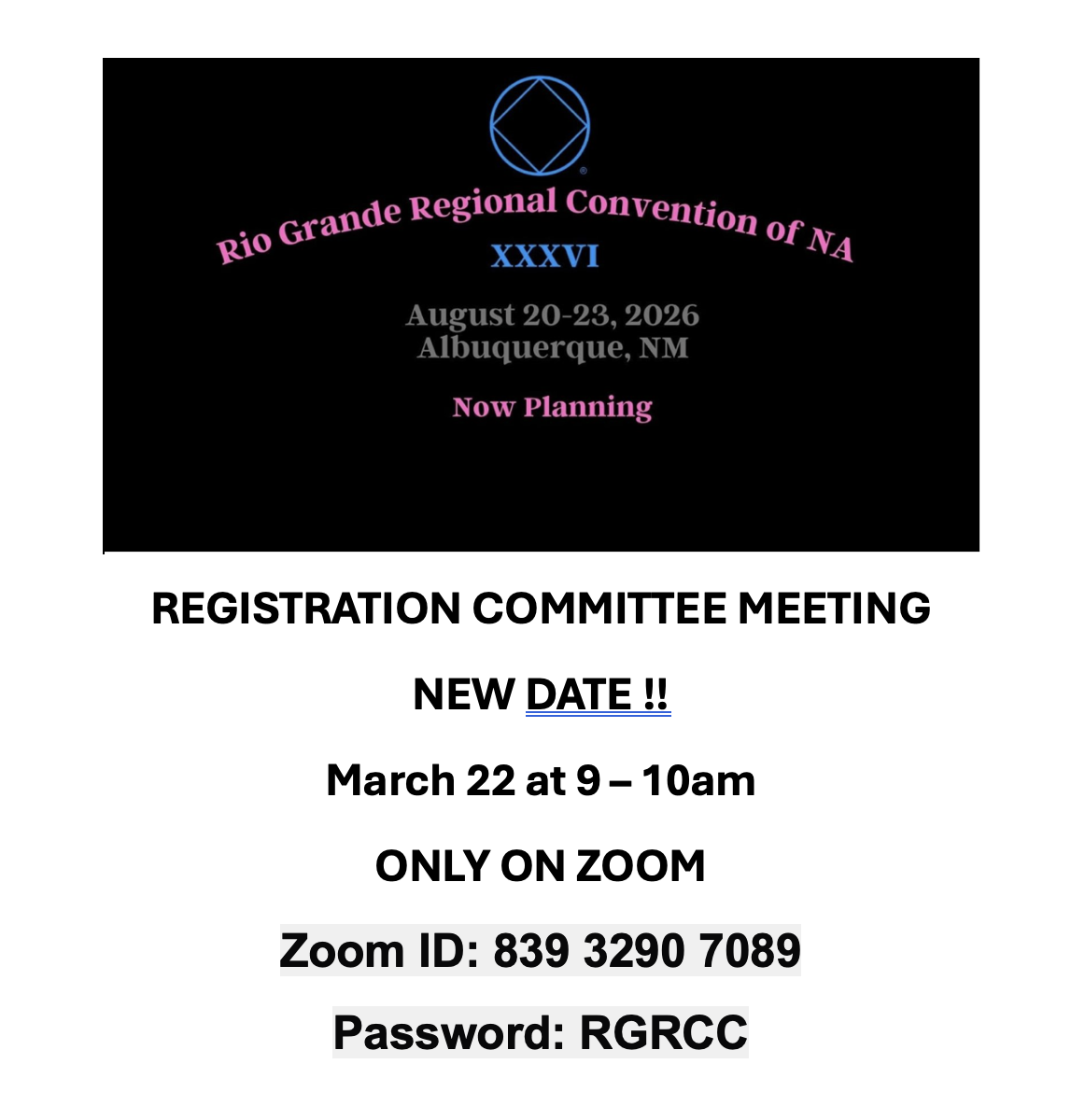 3:00 PM Regional Convention Registration Committee meeting on Zoom 839-3290-7089 pwd RGRCC